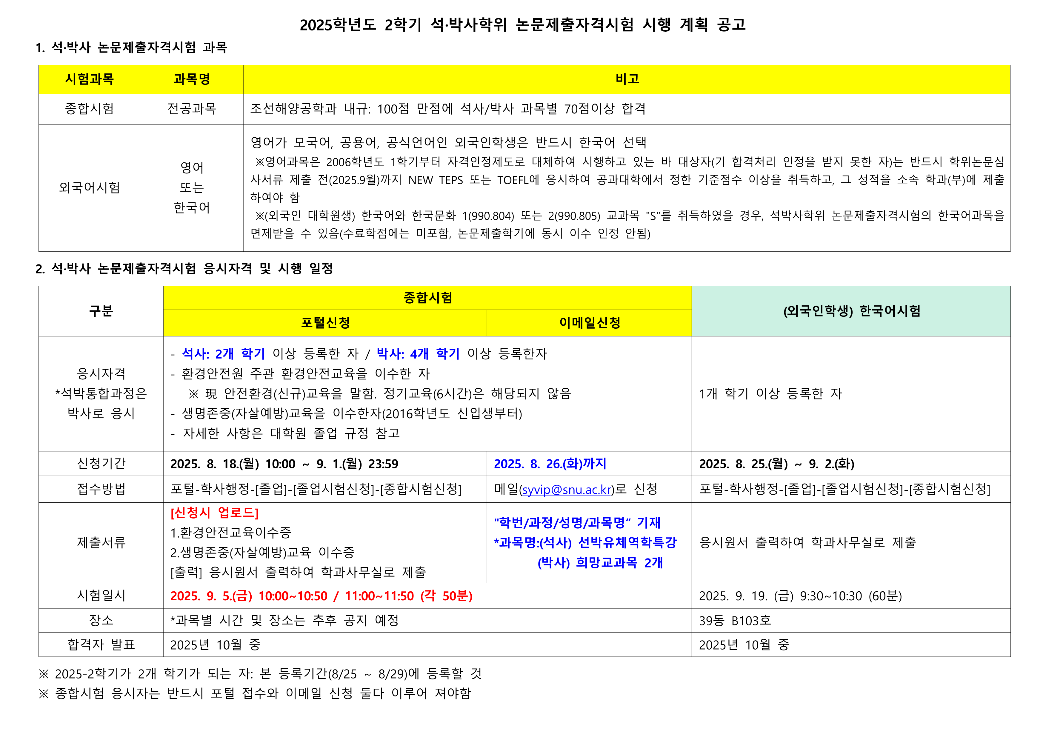 [대학원] 2025학년도 2학기 석·박사학위 논문제출자격시험 시행 계획 공고