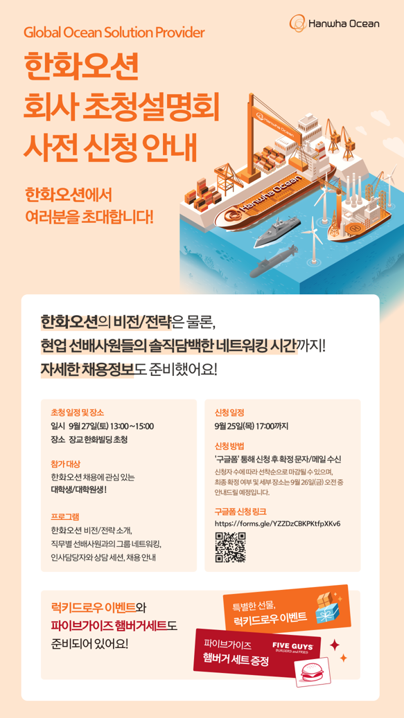 [공통] [한화오션] `25년 하반기 신입사원 채용 모집/ 회사초청 설명회 안내(신청접수기한: ~ 9/25(목)17시 까지)