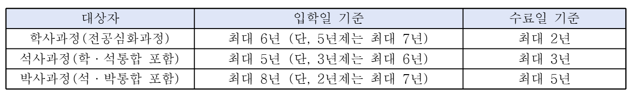 ※ 입학일 및 수료일 기준으로 체류기간 상한이 모두 남아있어야 함(단, 수료 제도가 없는 학사과정 등의 학위과정은 입학일 기준 상한만 적용)
