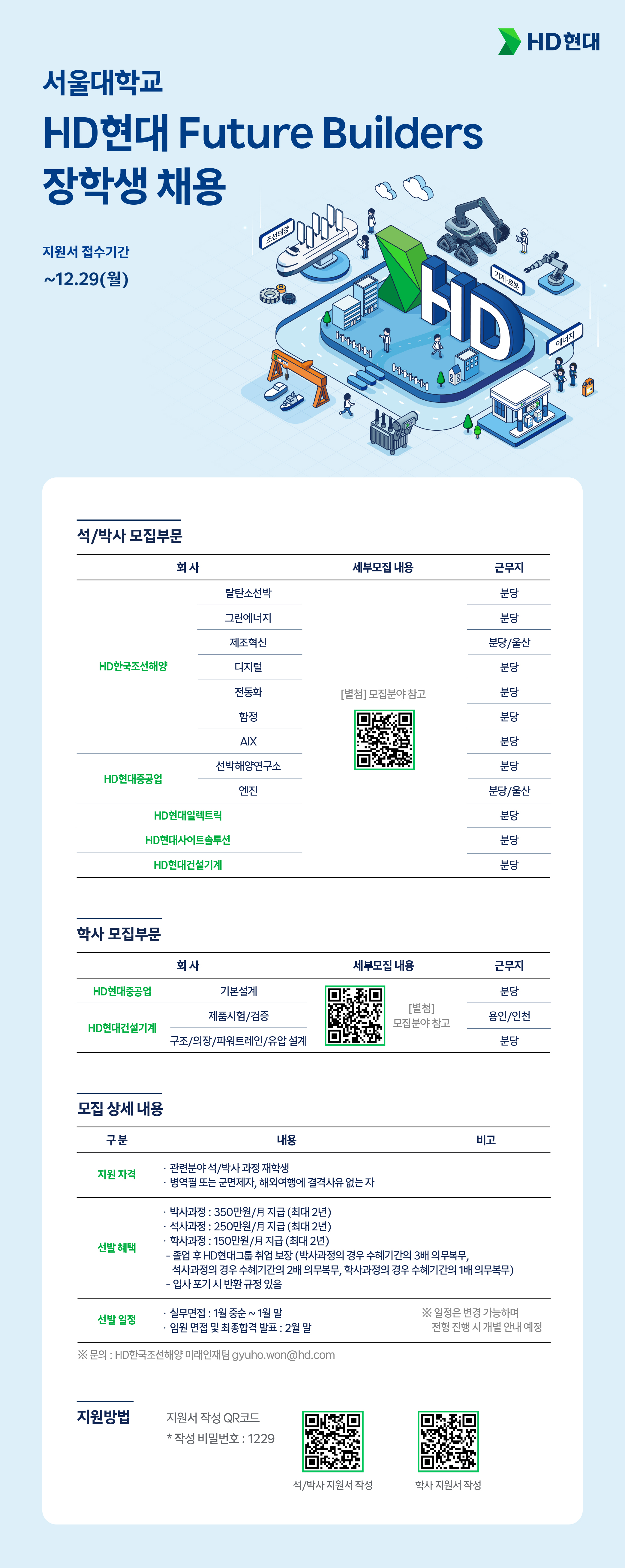 2026 HD현대 'Future Builders 장학생 채용' 서울대 런치설명회를 아래와 같이 안내하오니 관심있는 학생들의 많은 참여 바랍니다.