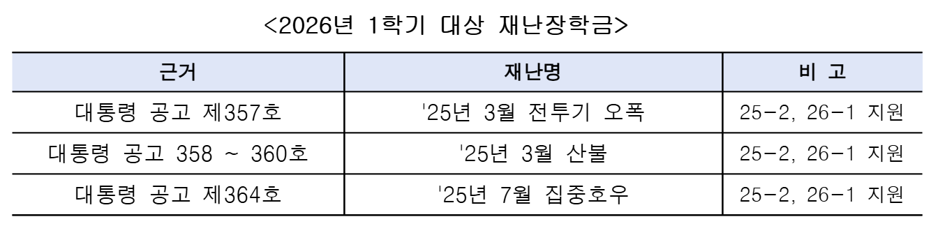 국가장학금 미신청자는 아래 재난장학금 지원이 불가하므로, 특별재난지역 내 피해가구 대학생은 반드시 국가장학금을 신청할 수 있도록 안내하여 주시기 바랍니다.