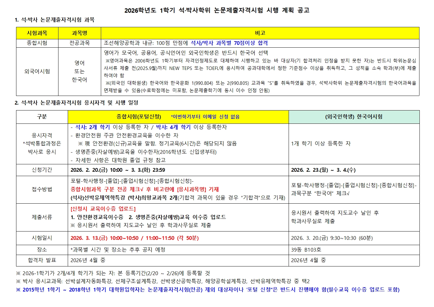[대학원] 2026학년도 1학기 석·박사학위 논문제출자격시험 시행 계획 공고
