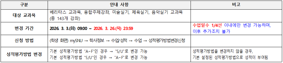 2026학년도 1학기 개설 공통교육과정 교과목 중 성적평가방법 변경이 가능한 교과목의 변경 기간 및 방법을 다음과 같이 안내하오니, 해당 학생은 기간 내 필히 변경하시기 바랍니다.