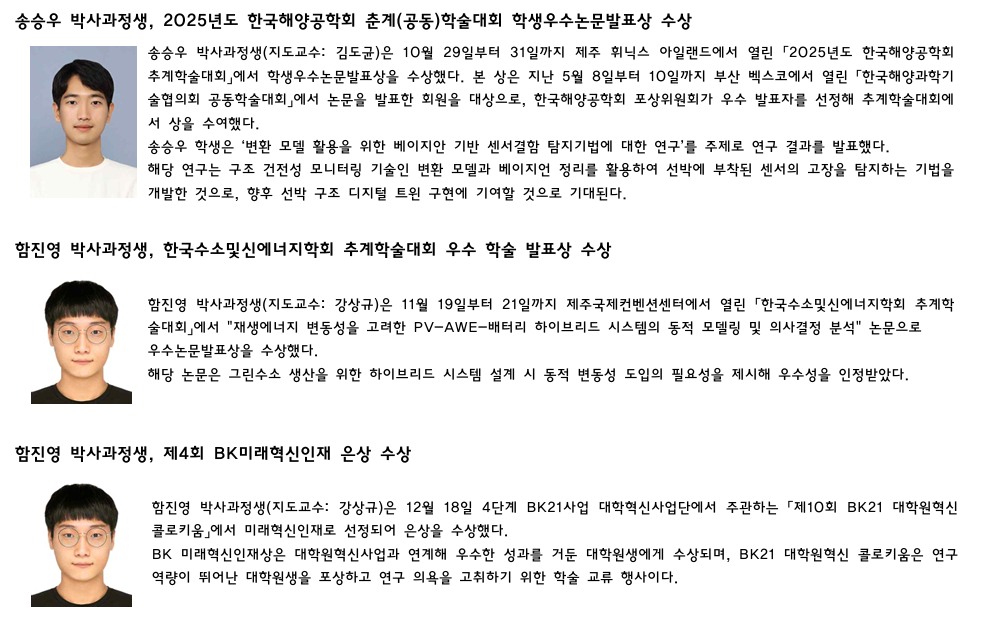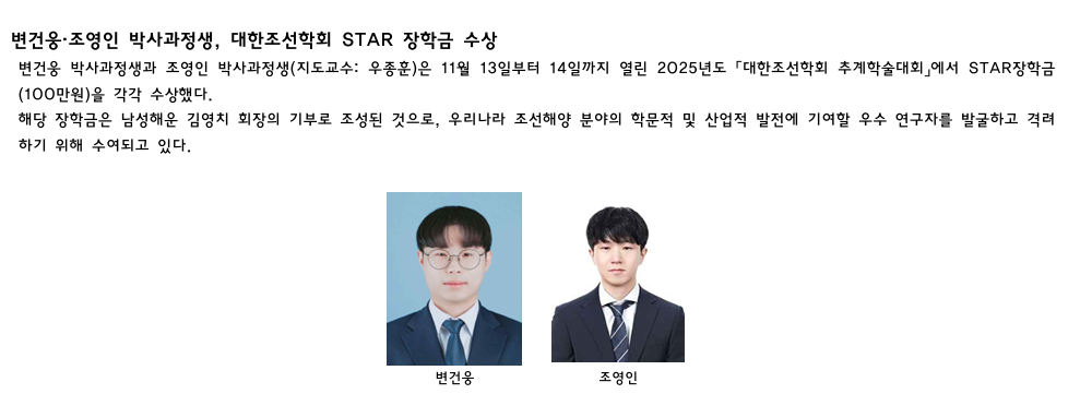 조선해양공학과 박사과정생.석사과정생 수상 소식